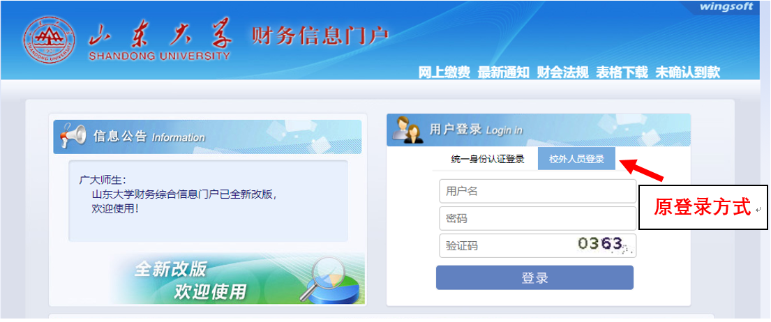 原财务登录方式将保留至2020年1月1日,如需使用请点击“校外人员登录”后,输入用户名、密码。